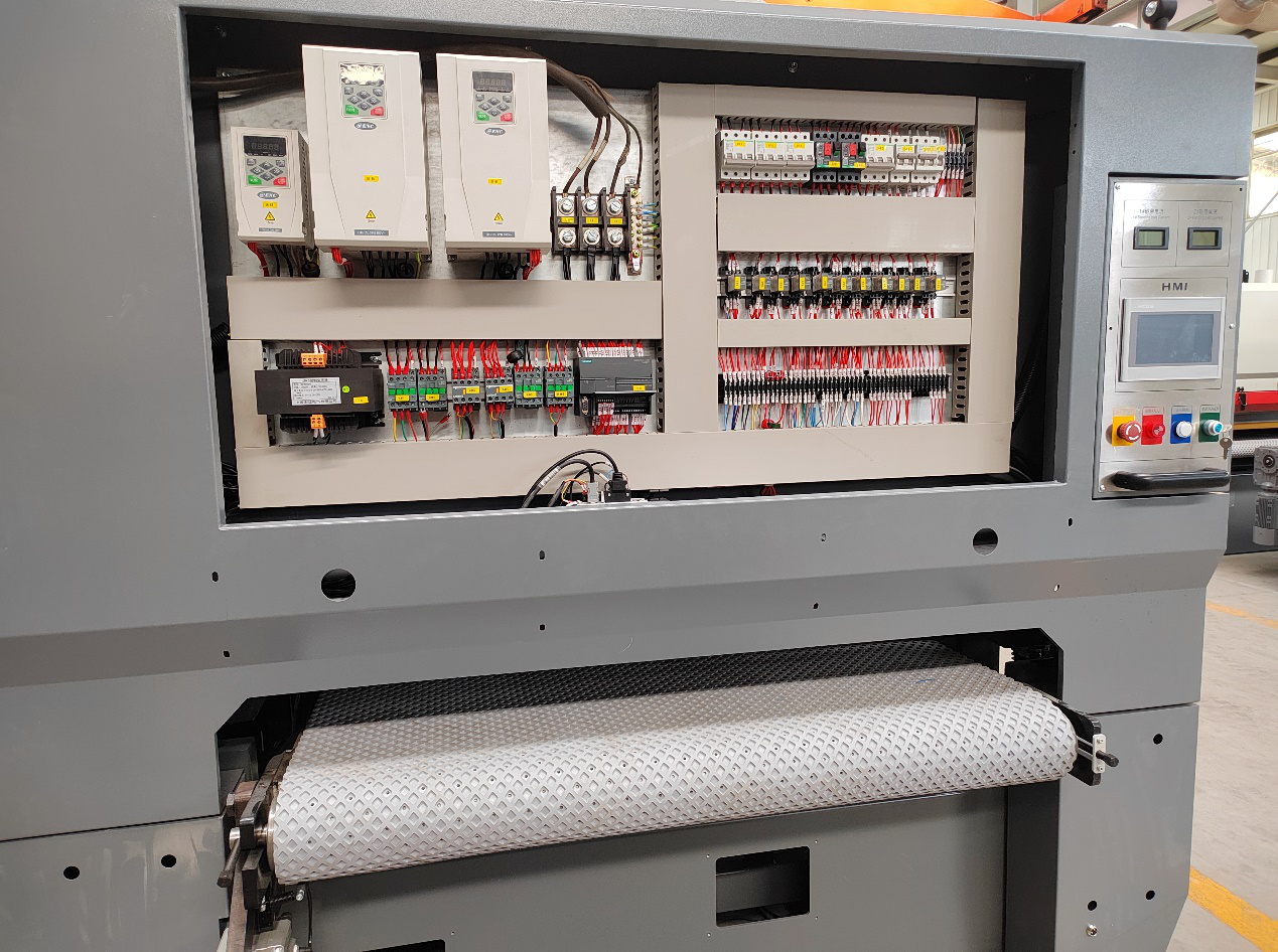 该设备采用耀世娱乐(中国)ENA100系列变频器,控制砂带旋转速度和送料速度的自动化砂光机,可实现无级变速,降低人力需求、增进产能。